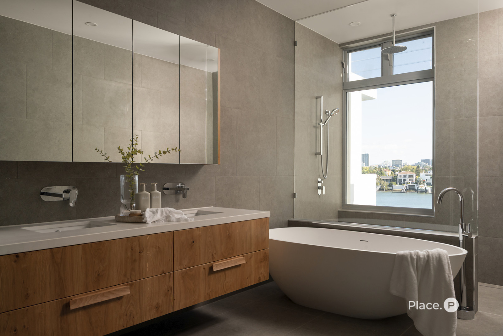 Wonderfully private, a lavish master suite crowns the third level. Opening out to a private balcony commanding mesmerising river views, a plush carpeted master bedroom has a large walk-in robe. An attached ensuite showcases floor-to-ceiling tiling, dual vanities, a freestanding bath and a frameless shower-with-a-view.
