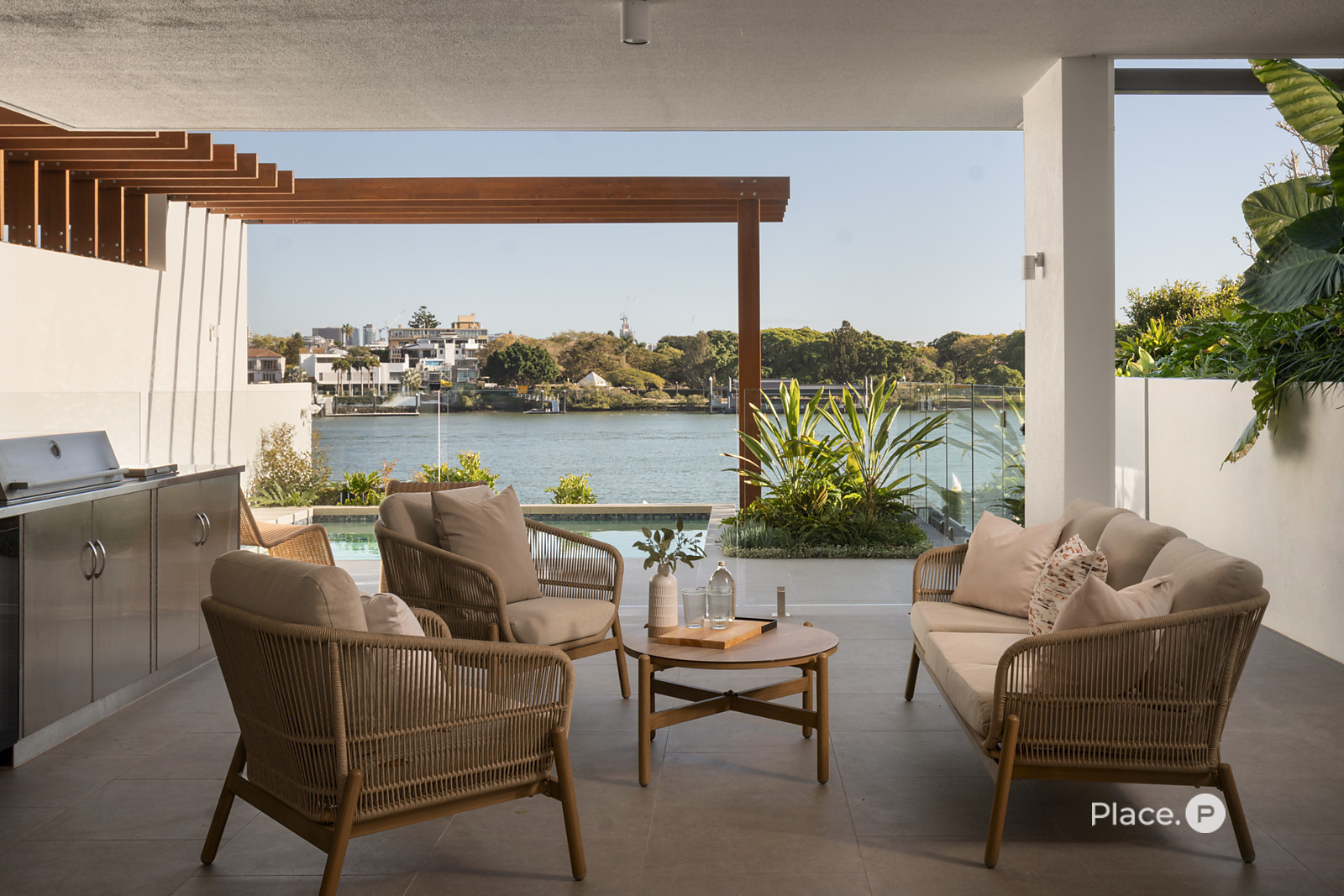 Extending the entertainment options downstairs, another generous living area has its own kitchenette. Steps away, a second al fresco area also boasting a full outdoor kitchen leads to a terraced rear yard and a spacious high river deck at the river edge. Here, you will find an opulent infinity-edge in-ground swimming pool, established gardens and direct shared pontoon access.
