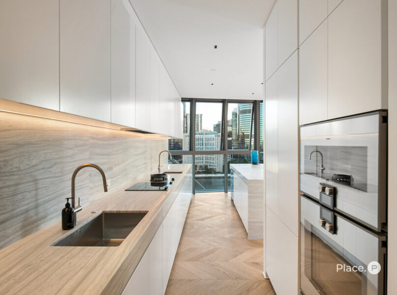 The kitchen is located nearby to provide easy access from the balcony and functional service to the dining room. Each residences kitchen was built with purpose and a focus on usability offering maximum bench space, an oversized dining island, Butlers pantry, walk-in pantry space, state of the art appliances and also, strategically positioned to take full advantage of the apartments wonderful views.