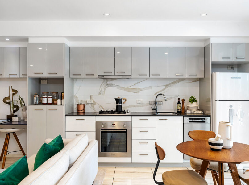 – Adjoining galley-style designer kitchen equipped with quality appliances, stone benchtops and ample cupboard storage