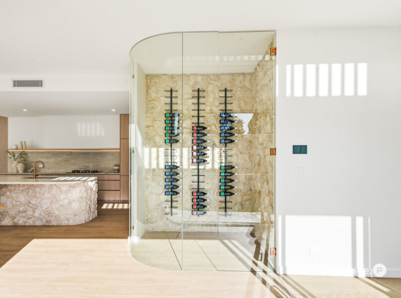 Curved glass wine cellar serving as a striking centrepiece to the open-plan living area