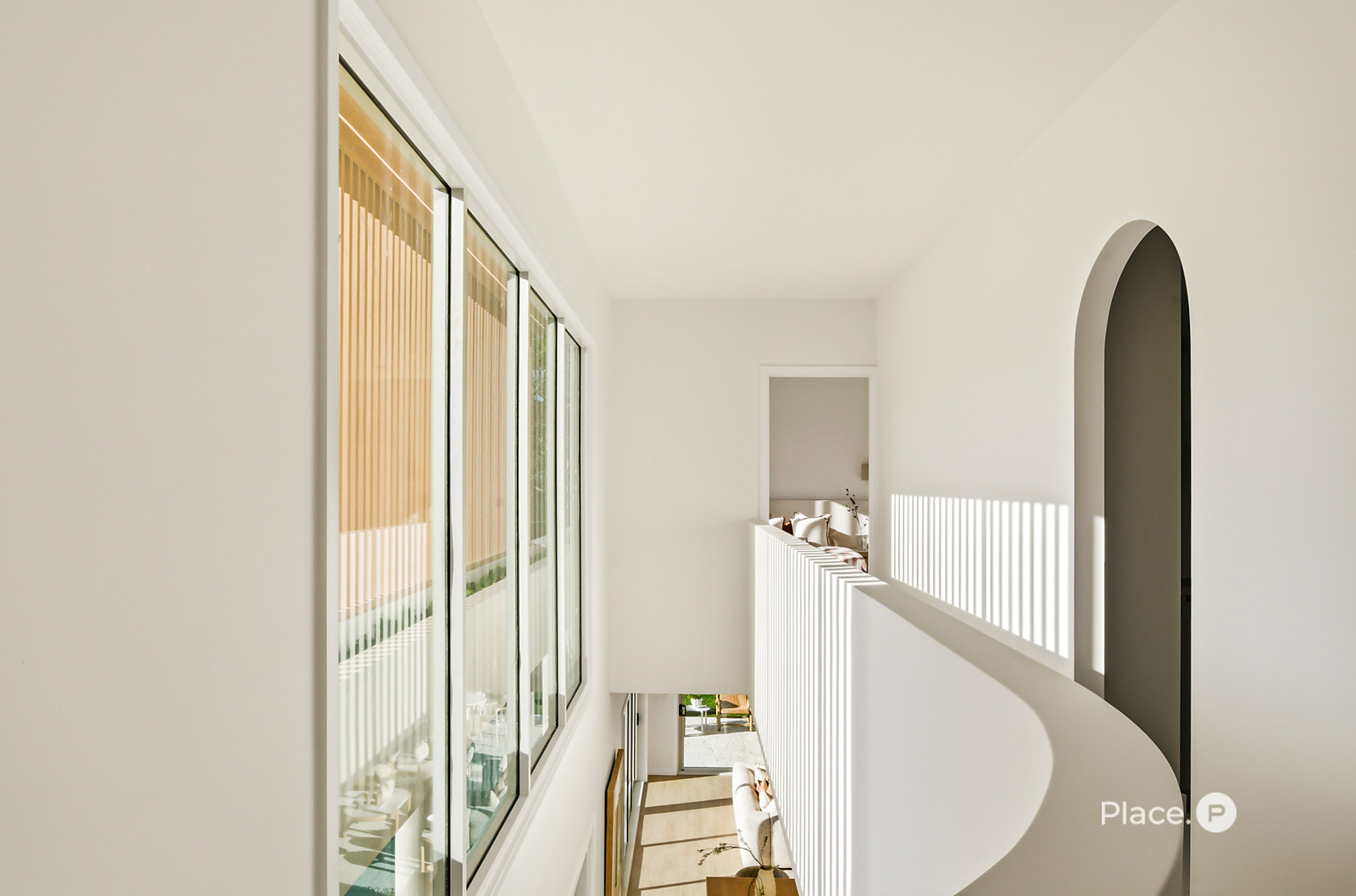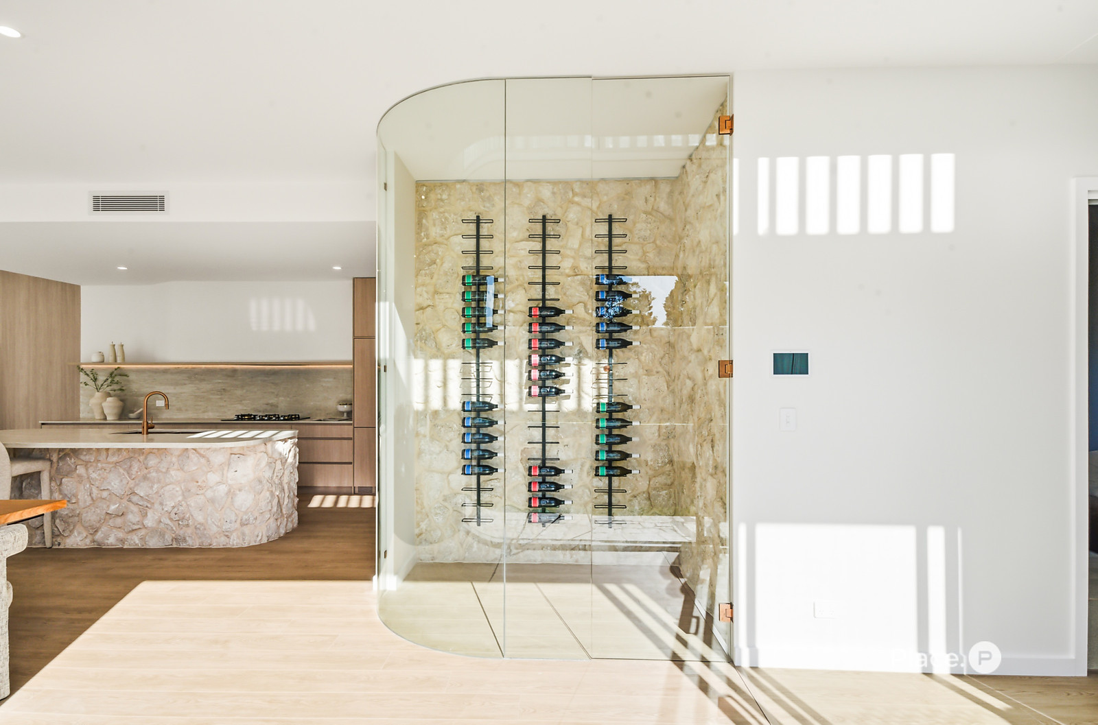 Curved glass wine cellar serving as a striking centrepiece to the open-plan living area