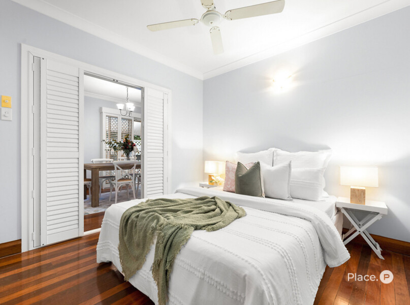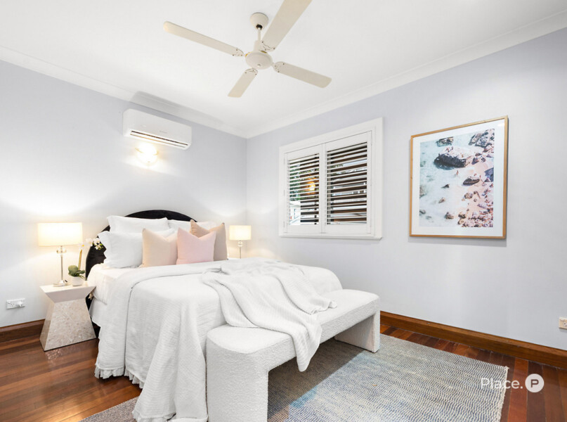 Upstairs, two bedrooms enjoy the convenience of a main appointed bathroom. Both rooms are enhanced with built-in robes and ceiling fans. The master bedroom further benefits from a split-system air conditioning unit, providing personalized climate control for ultimate comfort.