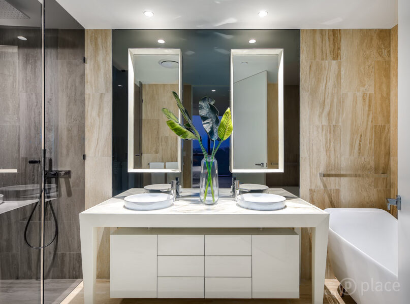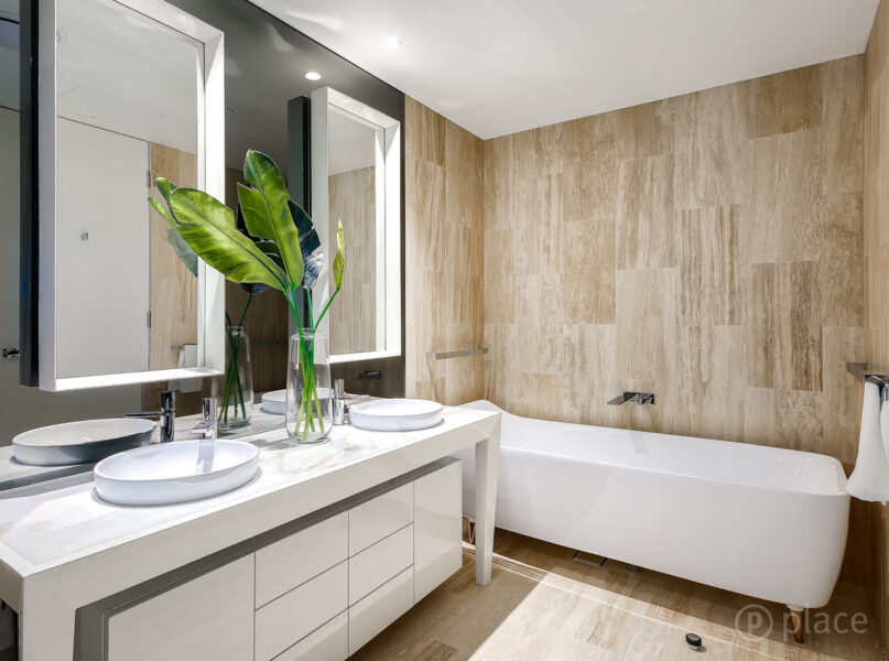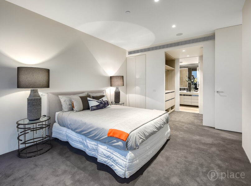 The master suite, one rarely experienced in a 2 bedroom apartment, integrated with a large walk through robe with timber cabinetry and into the spacious bathroom. With floor to ceiling travertine, separate toilet and shower with custom black out glass, his and hers vanity with storage behind and underneath and a feature freestanding bath, this will not disappoint.