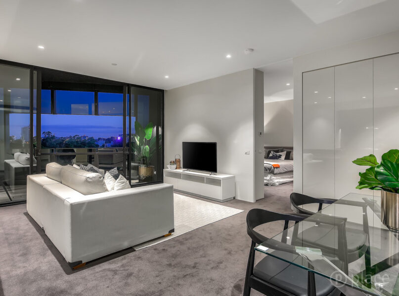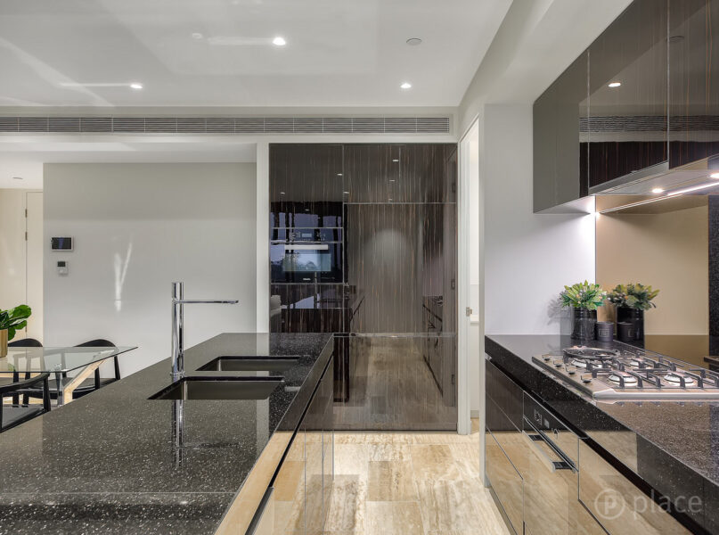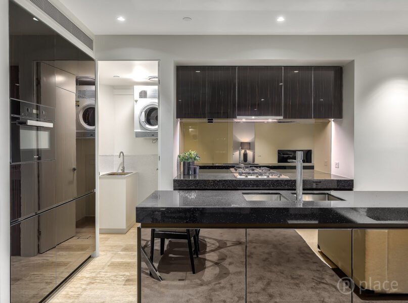 The long granite island bench, one of great proportions rarely seen in a 2 bedroom apartment, is positioned in the middle of the unit, with integrated fridge and freezer, Miele appliances and plentiful storage. Located close by is a separate laundry and storage area. With open plan living front of mind, the spacious living and dining area flow directly from the kitchen and out to the balcony, whilst at all times all area of the apartment embrace spectacular views of the river and botanic gardens.