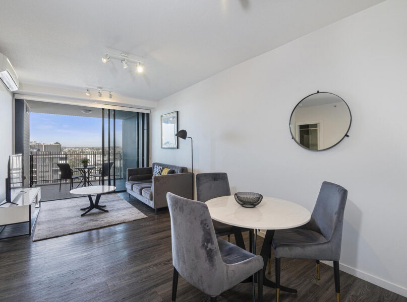 This apartment boasts a rooftop pool and barbecue area with 360-degree views across Brisbane’s heartland, providing a perfect spot to relax and entertain. Stay fit in the on-site gym. The open-plan living and dining arrangement is spacious, featuring vinyl planking, high ceilings, and air conditioning. The private balcony offers views, making it an excellent place for drinks and meals.