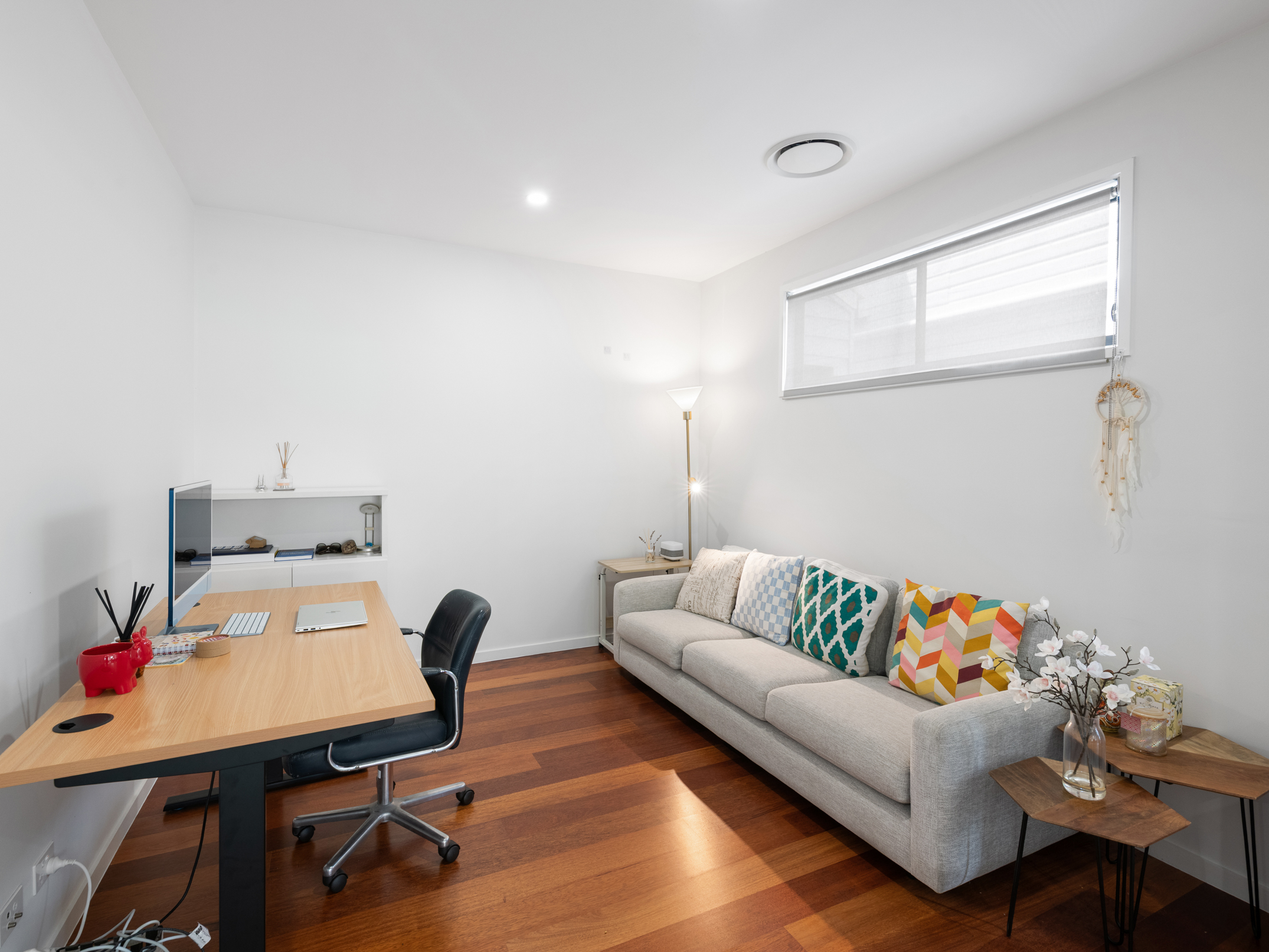 Completing the ground level is a functional second living or home office, that is separated from the combined living area by timber panelling. Upstairs, an additional living area or fifth bedroom with a built-in robe links to a front balcony.
