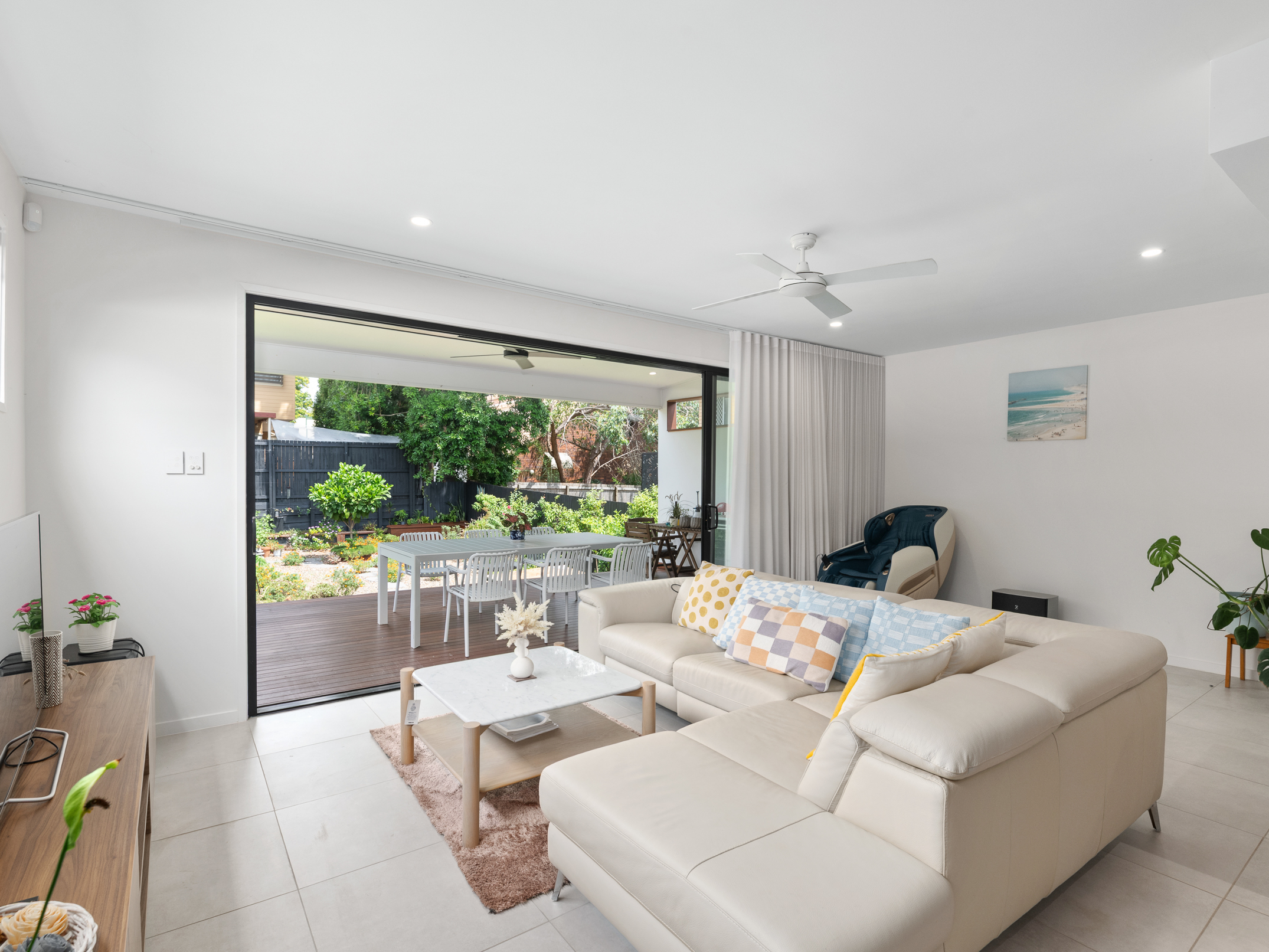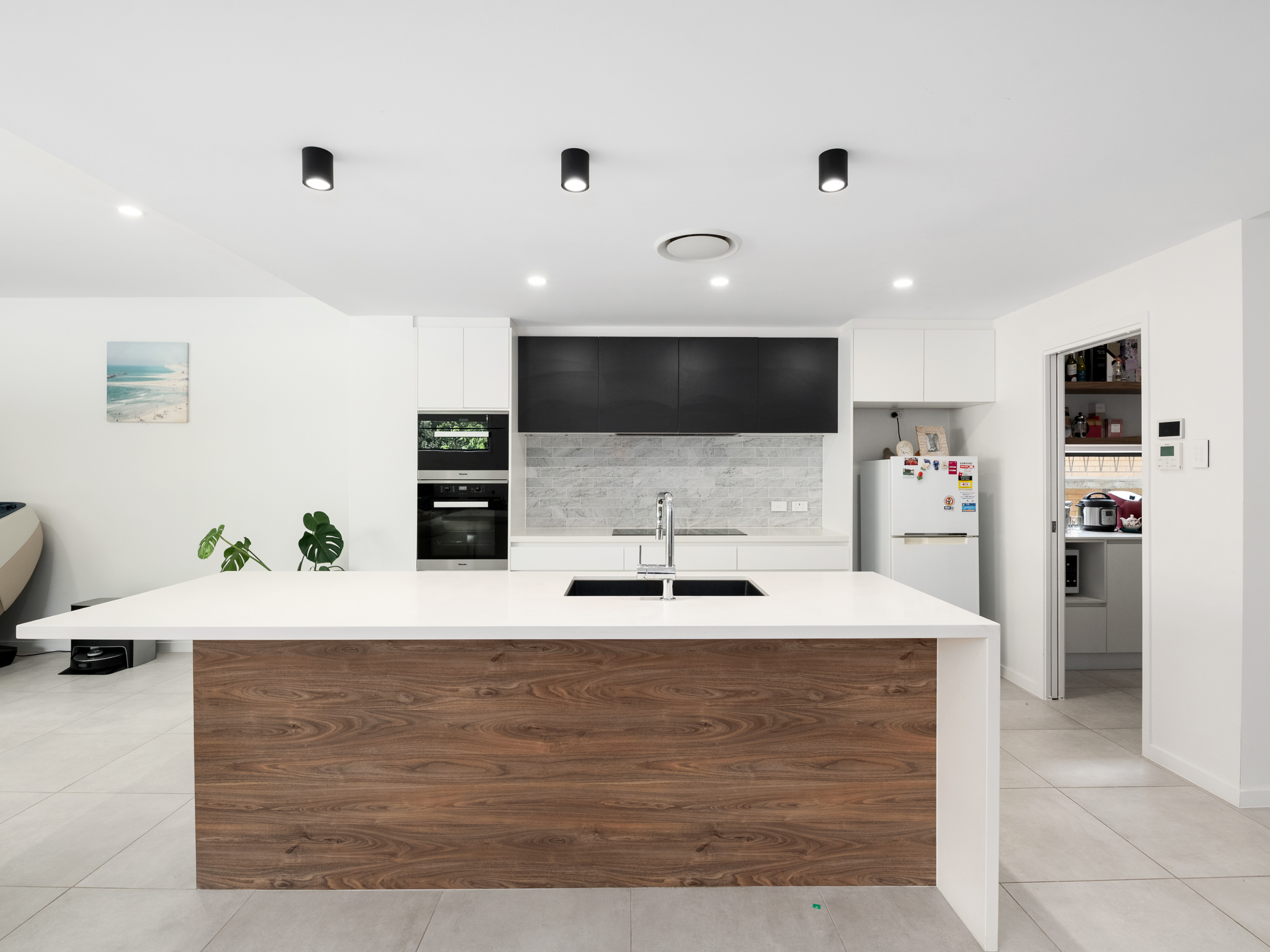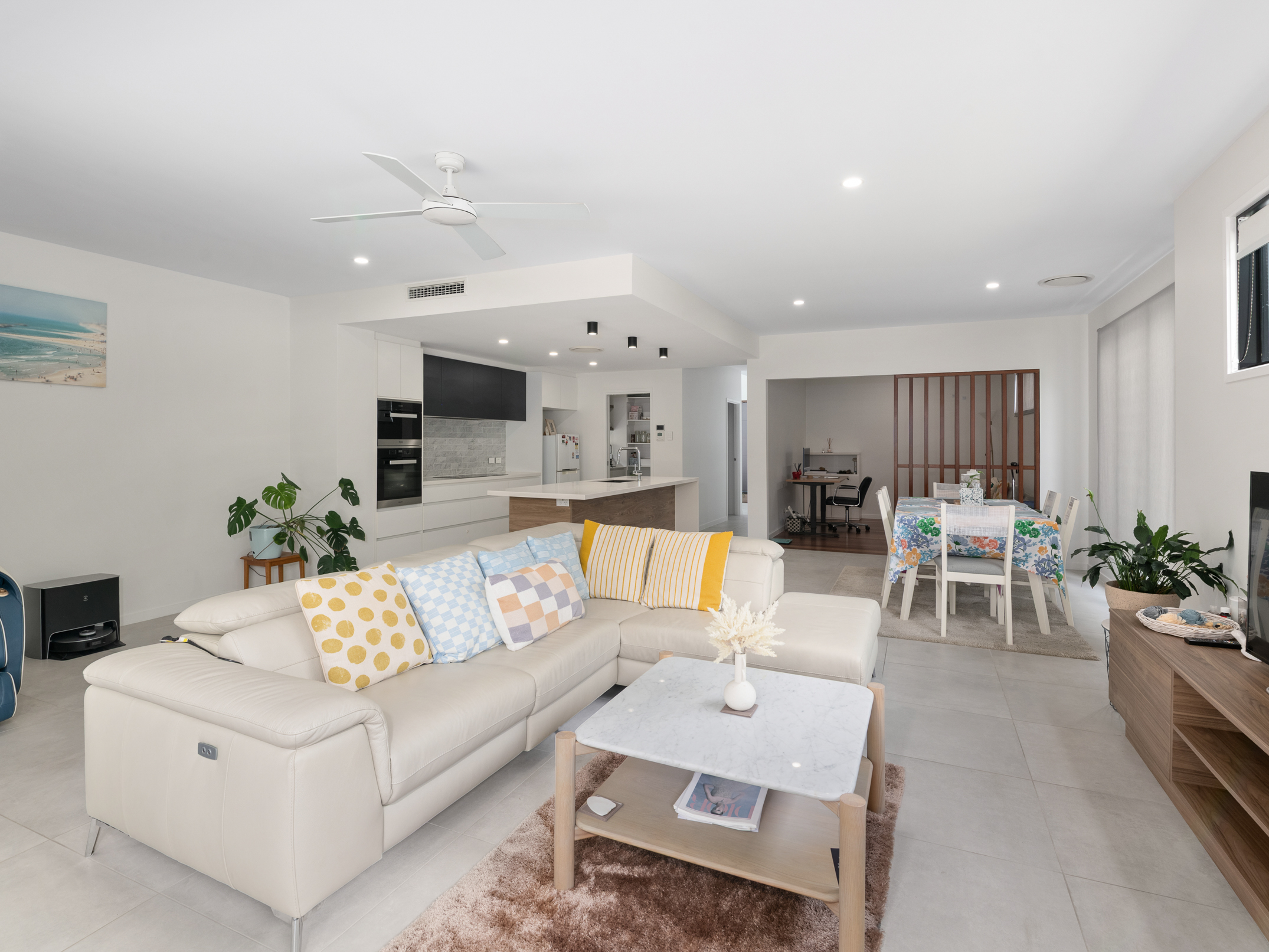 Featuring beautiful tiled flooring and a fresh white colour palette, the residence continues from its entry to a spacious open-plan living and dining area at its rear. A fabulous setting for relaxing and hosting guests, this light-filled space encompasses a spectacular kitchen with waterfall stone benchtops, a breakfast bar, butler’s pantry, Miele appliances and ample cupboard storage.