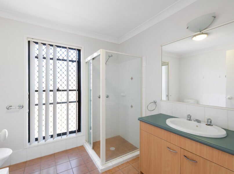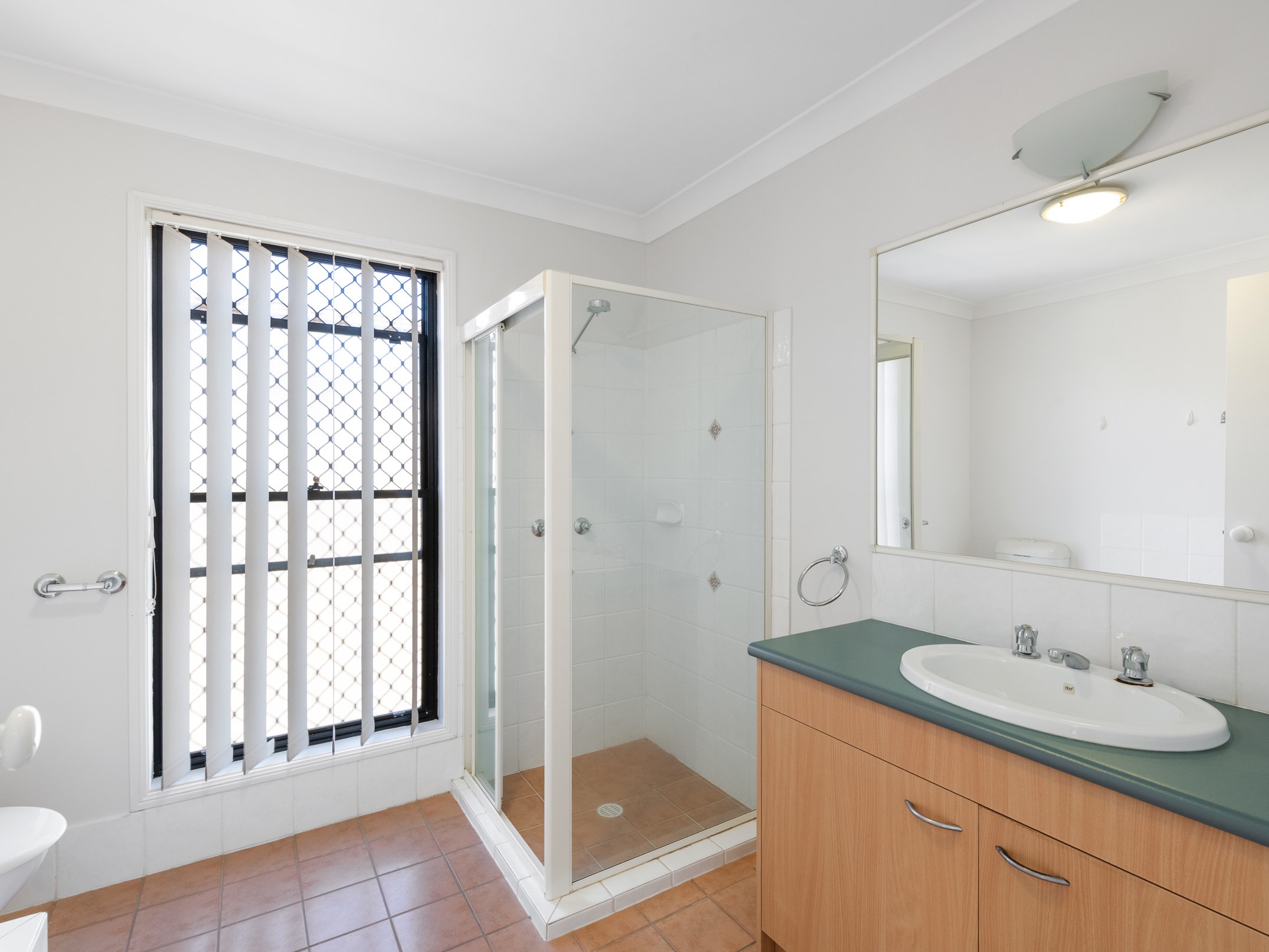 Upstairs, the master bedroom boasts an ensuite, air conditioning, ceiling fan, and ample storage. Two additional bedrooms also feature ceiling fans, with all windows fitted with security screens for peace of mind. A separate toilet downstairs adds everyday convenience, and the single remote-access garage provides secure parking.
