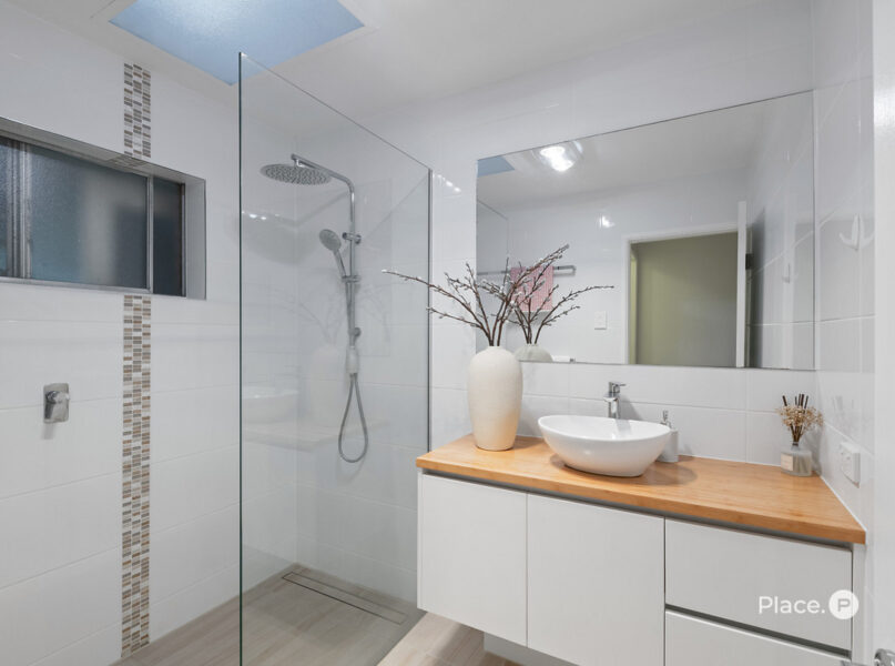 – Bedroom 3: Carpeted, featuring a ceiling fan, split-system air conditioning, and mirrored robes.
