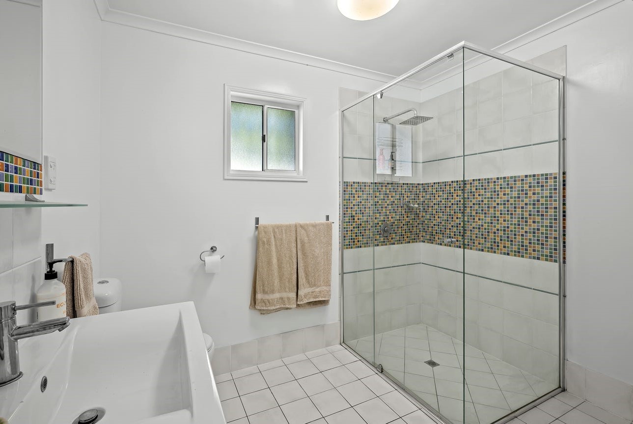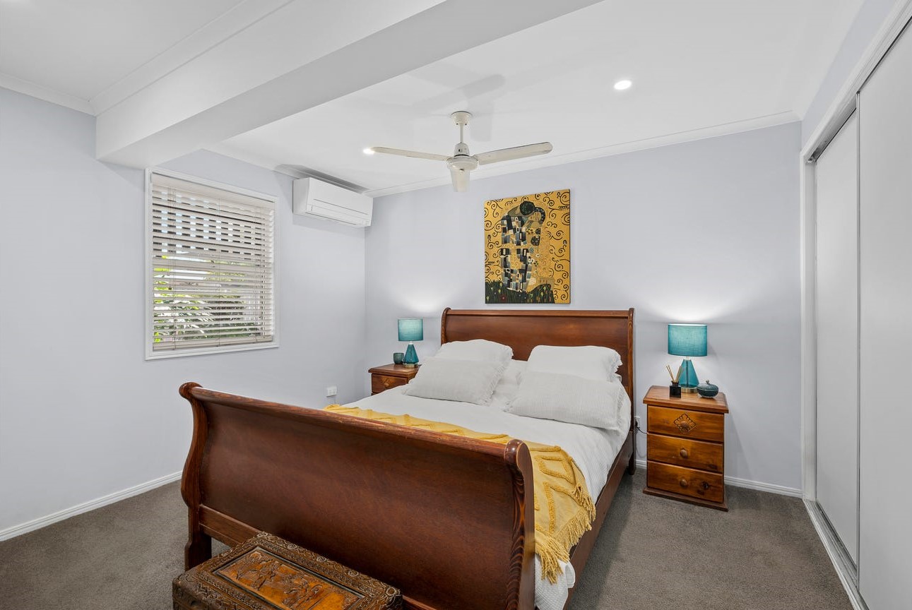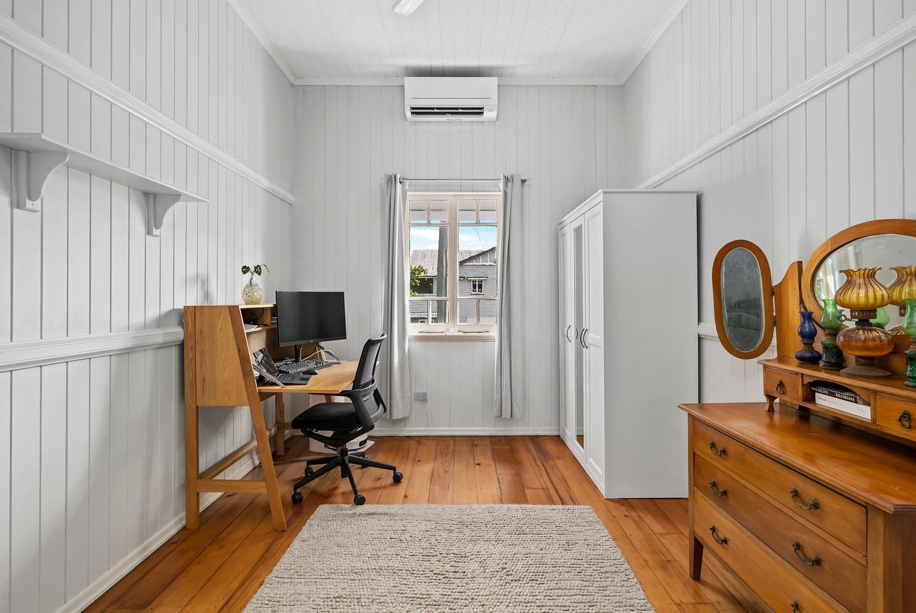The upper level comprises two generous bedrooms, a large sunroom and a third bedroom or study. All bedrooms and living areas are fitted with split-system air conditioning and ceiling fans, while a beautifully renovated main bathroom services this level.